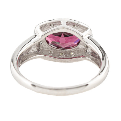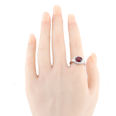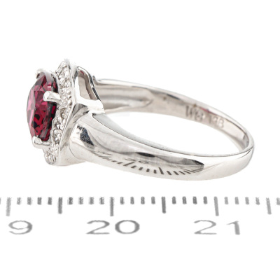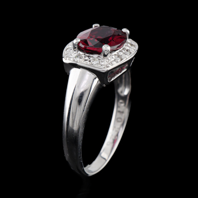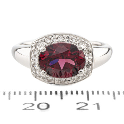 Garnet and Diamond ring with oval shape Natural Garnet of 2.25ct and round Natural Diamonds totalling 0.10ct. 18ct white gold. Ring size L. Band width: 5.0mm - 1.9mm. Weight: 4.7g. (Pre-owned)