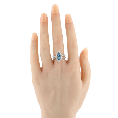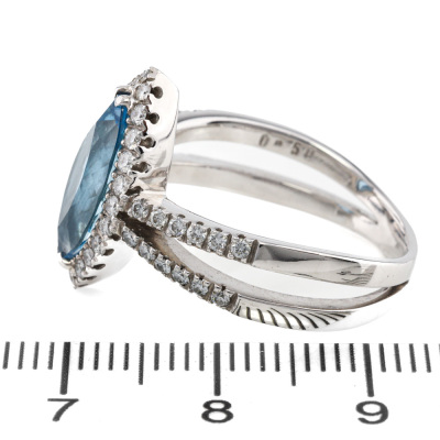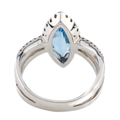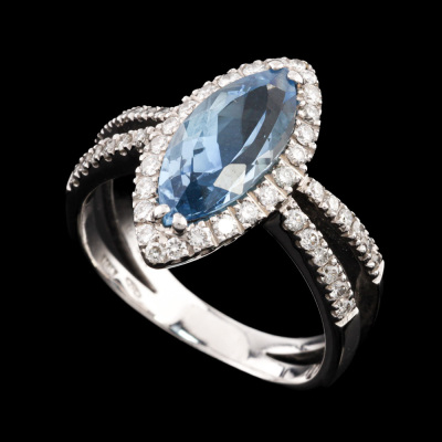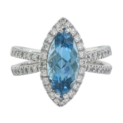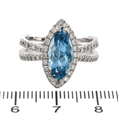 Aquamarine and Diamond ring with centre marquise cut Natural Aquamarine of 2.26ct and round Natural Diamonds totalling 0.50ct (Estimated grading: G-H SI). 18ct white gold. Ring size N. Band width: 3.2mm. Weight: 7.2g. (Pre-owned)