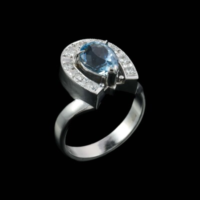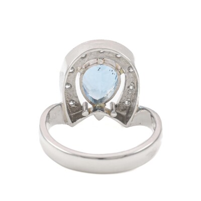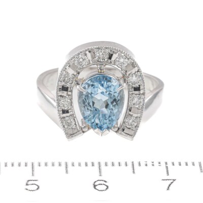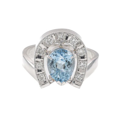 Horseshoe design ring with pear shape Natural Aquamarine of 2.26ct and round Natural Diamonds totalling 0.26ct. Platinum - 850. Ring size O½. Band width: 3.3mm. Weight: 8.8g. (Pre-owned)