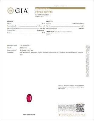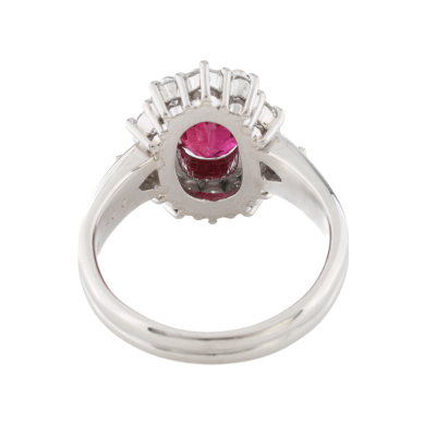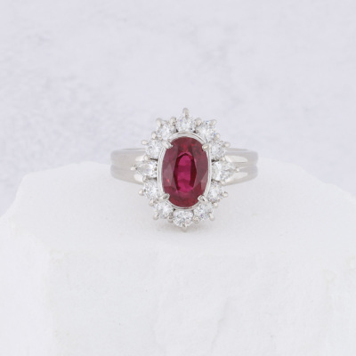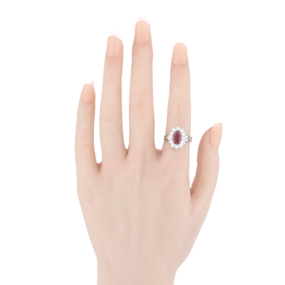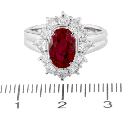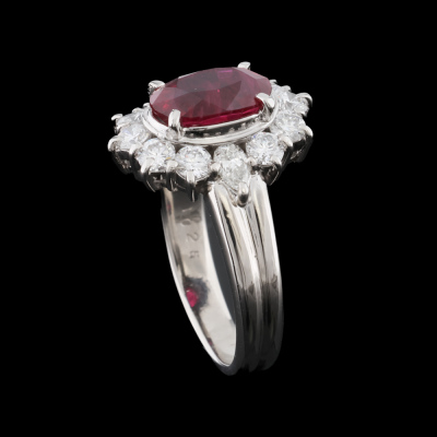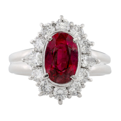 Ruby and Diamond ring with oval shape Natural Ruby of 2.27ct (with GIA Report #1503566561) and round & Pear shape Natural Diamonds totalling 1.02ct (Estimated grading: G-H VS-SI). Platinum - 900. Ring size: L. Band width: 3.1mm - 3.8mm. Weight: 9.0g.