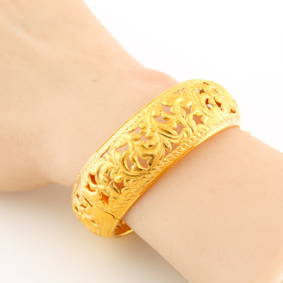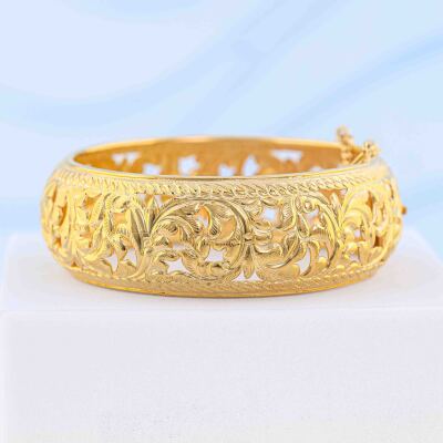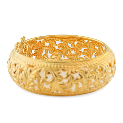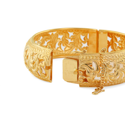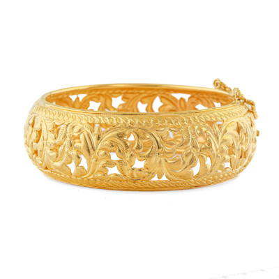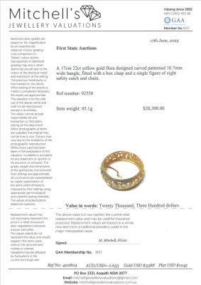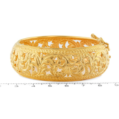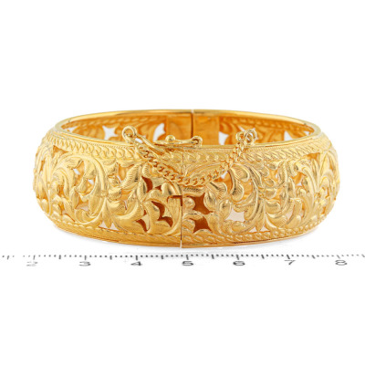 Gold flora designed carved bangle. 22ct yellow gold with safety chain. Circumference: 17cm. Width: 10.7mm. Weight: 45.1g. With Valuation Certificate #420804. (Pre-owned)