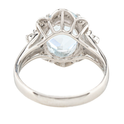 Aquamarine and Diamond ring with oval shape Natural Aquamarine of approximately 2.30ct and round Natural Diamonds totalling approximately 0.20ct. Platinum - 900. Ring size M½. Band width: 2.5mm - 4.5mm. Weight: 6.5g. (Pre-owned)