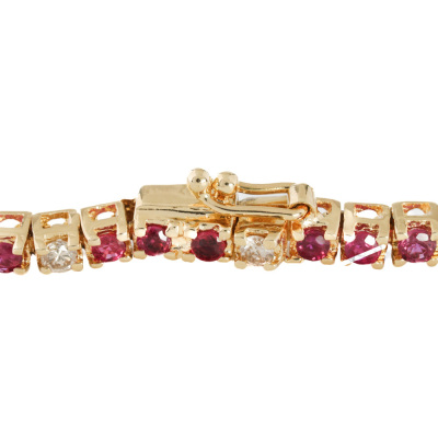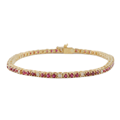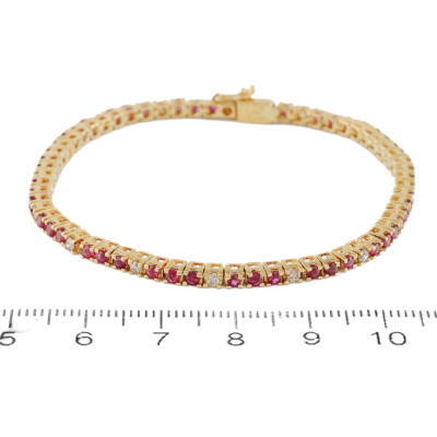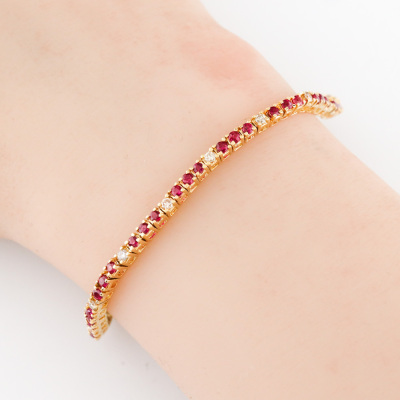 Ruby and Diamond bracelet with round Natural Rubies totalling 2.30ct and round Natural Diamonds totalling 0.54ct (Estimated grading: J-K SI). 18ct yellow gold. Length: 17cm. Weight: 10.5g. (Pre-owned)