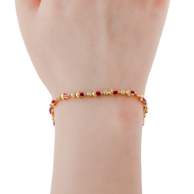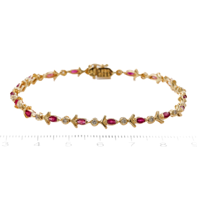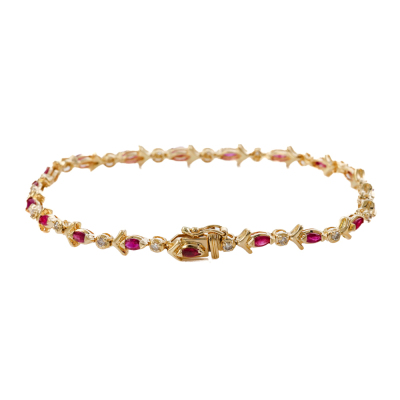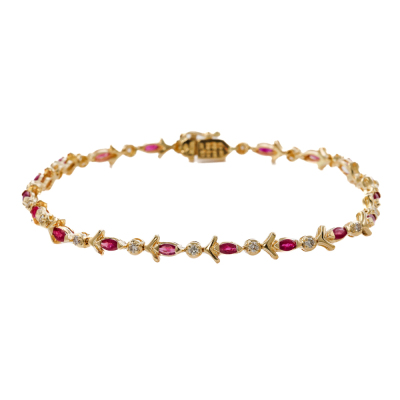 Ruby and Diamond bracelet with marquise cut Natural Rubies totalling 2.30ct and round Natural Diamonds totalling 0.33ct (Estimated grading: H-I SI-P1). 18ct yellow gold. Length: 18cm. Weight: 8.4g.