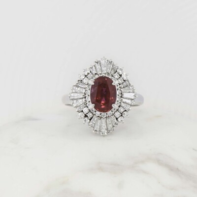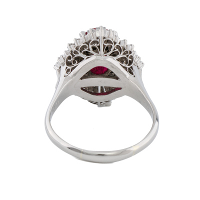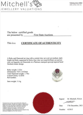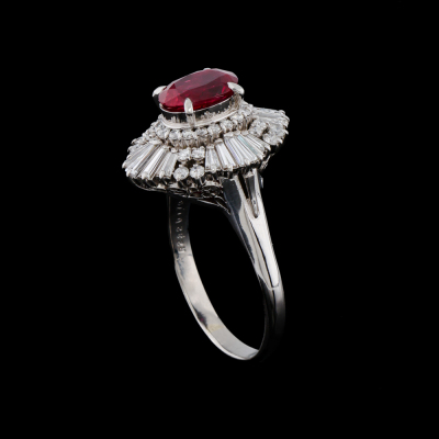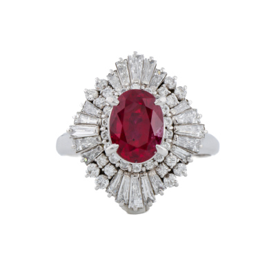 Ruby and Diamond ring with oval cut Natural Ruby of 2.32ct and round & baguette cut Diamonds totalling 1.79cts (Estimated grading: G-H SI). Platinum 900. Ring size: R1/4. Band width: 2.6mm - 3.0mm. Weight: 11.6g. With copy of Certificate #415015. (Pre-owned)