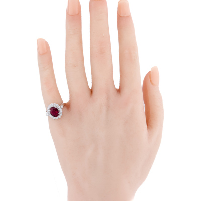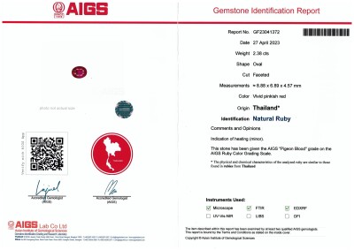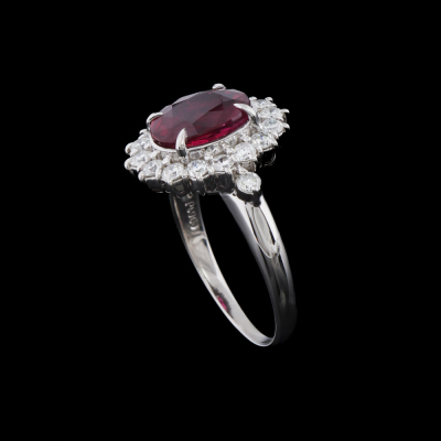 Ruby and Diamond ring with oval shape vivid red Natural Ruby of 2.38ct (with AIGS report# GF23041372, Origin Thailiand, Colour: Pigeon Blood) and round Natural Diamonds totalling 0.60ct (Estimated grading: G-H VS). Platinum - 900. Ring size: K½. Band width: 1.2mm - 3.0mm. Weight: 5.6g. (Pre-owned)