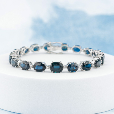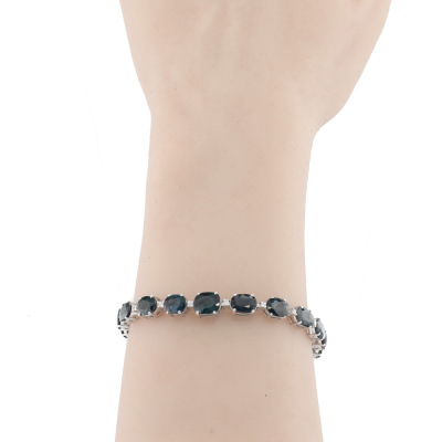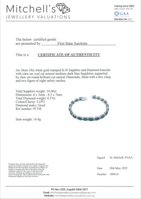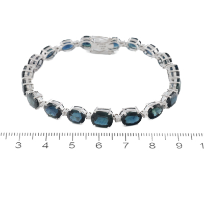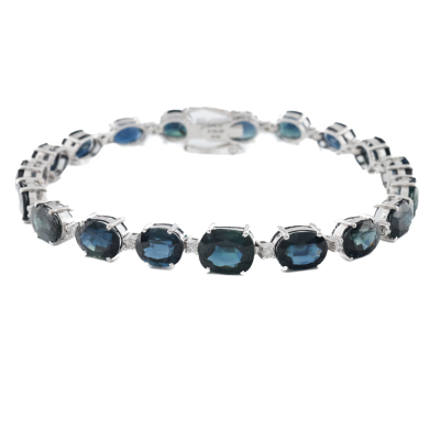 Sapphire and Diamond bracelet with oval shape Natural Teal and Blue Sapphires totalling 24.00ct and round Natural Diamonds totalling 0.37cts (Estimated grading: I-J P2). 18ct white gold. Length: 18cm. Weight: 14.9g. With Certificate #420616. (Pre-owned)