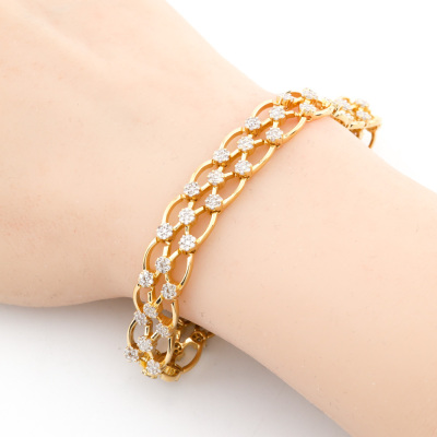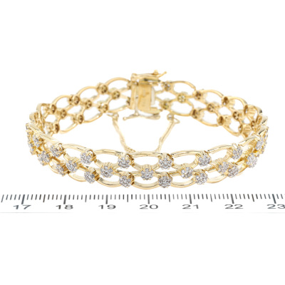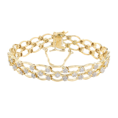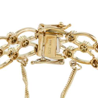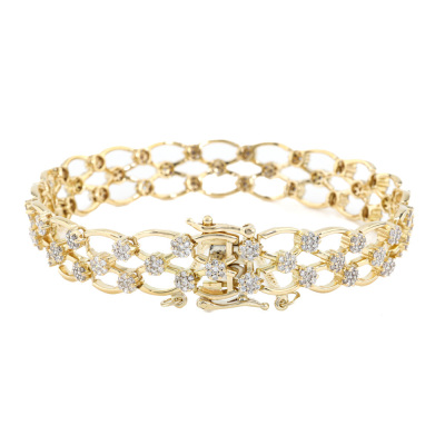 Lace pattern Diamond bracelet with round single cut Natural Diamonds totalling approximately 2.40ct (Estimated grading: H-I SI). 18ct yellow gold. Length: 19cm. With Safety chain of 7cm. Width: 10.6mm. Weight: 24.8g. With stamp 'MHJ'. With Valuation Certificate #421461. (Pre-owned)