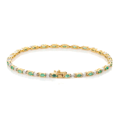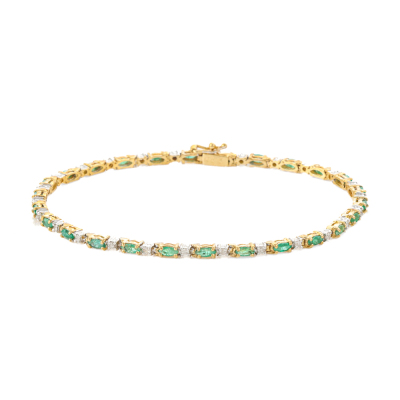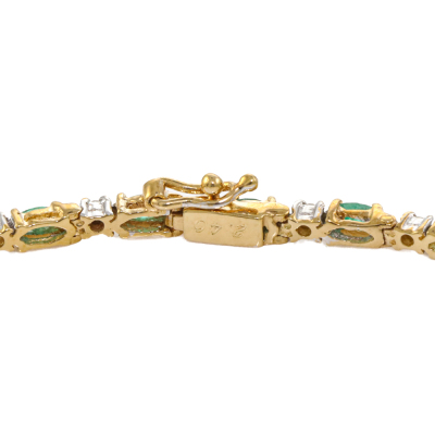 Emerald and Diamond bracelet with 26 marquise cut Natural Emeralds totalling 2.40ct and round Natural Diamonds totalling 0.38ct (Estimated grading: HIJ P2-P3). 18ct yellow gold. Length: 19cm. Weight: 8.6g. (Pre-owned)