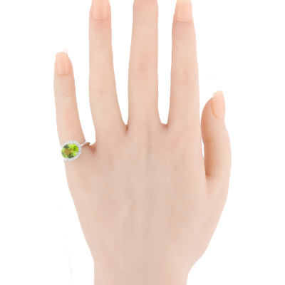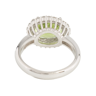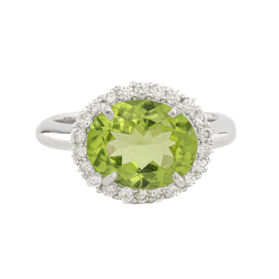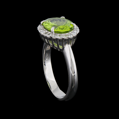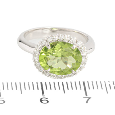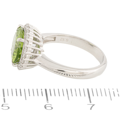 Peridot and Diamond ring with centre oval shape Natural Peridot of approximately 2.40ct and round Natural Diamonds totalling 0.32ct (Estimated grading: G SI). Platinum - 900. Ring size: I. Band width: 2.6mm. Weight: 6.0g. (Pre-owned)