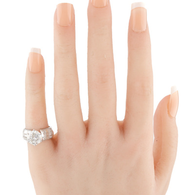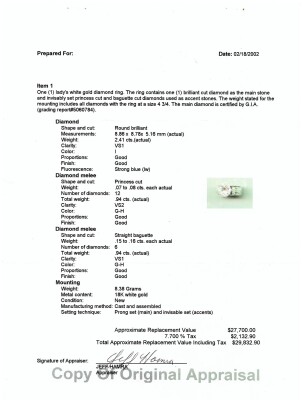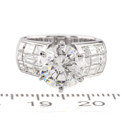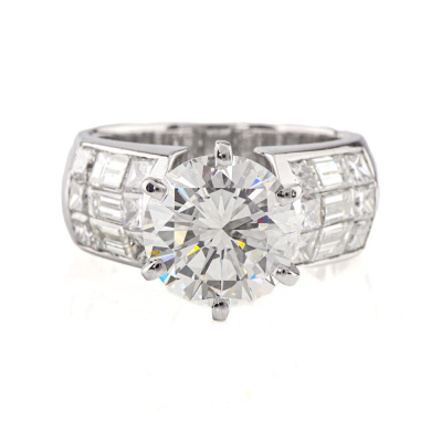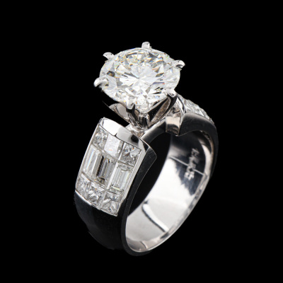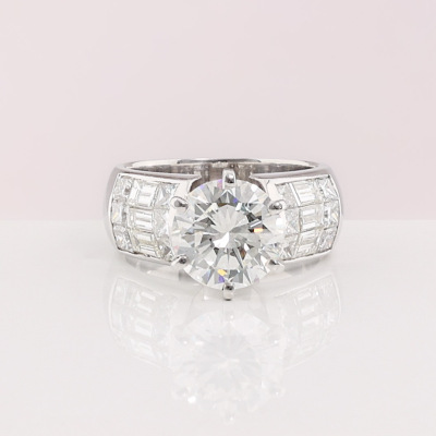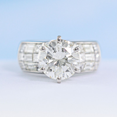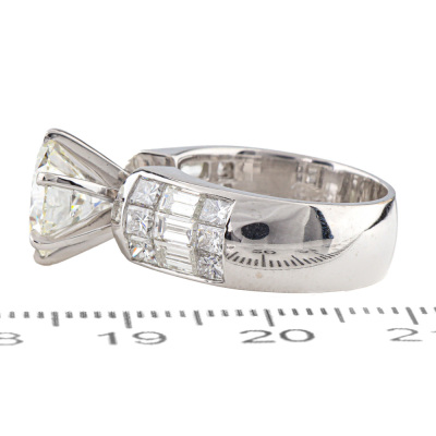 Diamond ring with round brilliant cut Natural Diamond of 2.41ct (with GIA Report graded as I VS1 #5060784) and baguette and princess cut Natural Diamond shoulders totalling 1.74ct. (Estimated grading: H-I VS-SI). 18ct white gold. Ring size: I. Band width: 7.1mm - 6.2mm. Weight: 8.3g (Pre-owned)