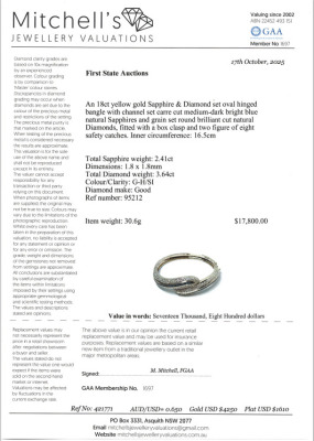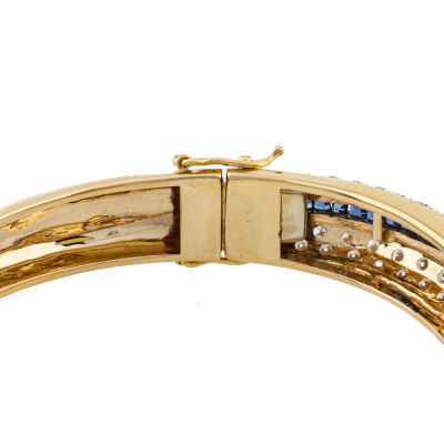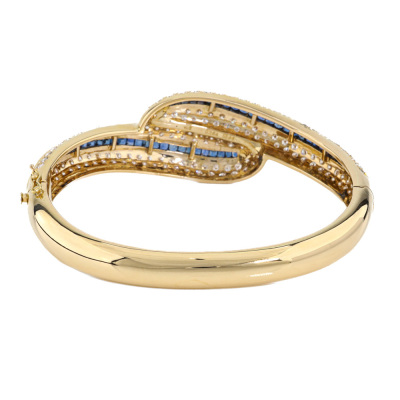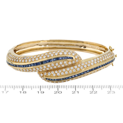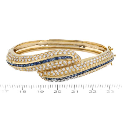 Sapphire and Diamond bangle with carre cut Natural blue Sapphires totalling 2.41ct and round Natural Diamonds totalling 3.64ct (Estimated grading: G-H SI). 18ct yellow gold. Inner circumference: 16.5cm. Weight: 30.6g. With Certificate #421771. (Pre-owned)