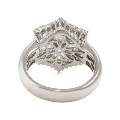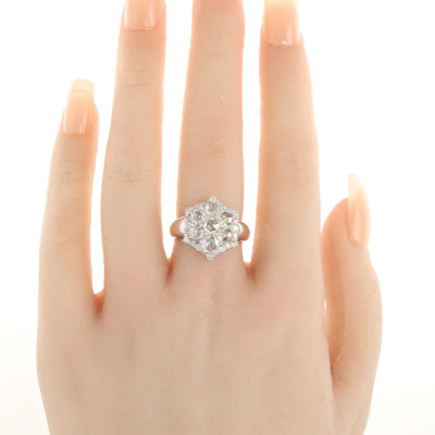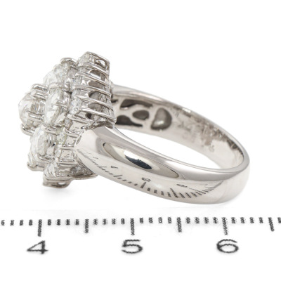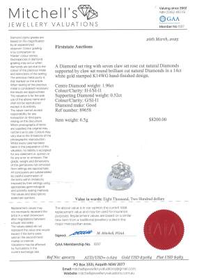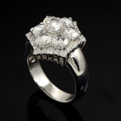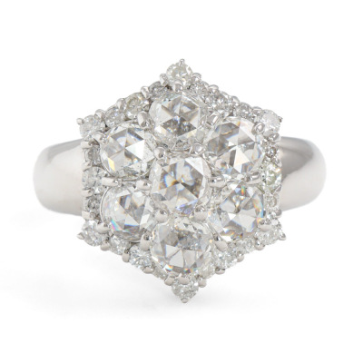 Diamond dress ring with 7 centre rose cut Natural Diamonds totalling 1.90ct (Estimated grading: H-I SI-P1) and surrounding of round Natural Diamonds totalling 0.52ct (Estimated grading: G SI-P1). 14ct white gold. Ring size M. Band width: 3.9mm - 5mm. Weight: 6.5g. With Valuation Certificate #420275. (Pre-owned)