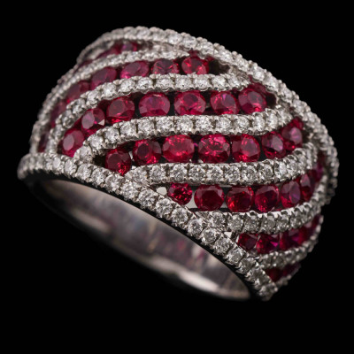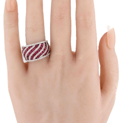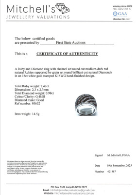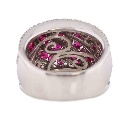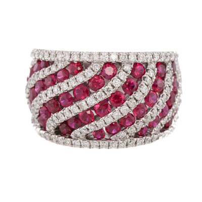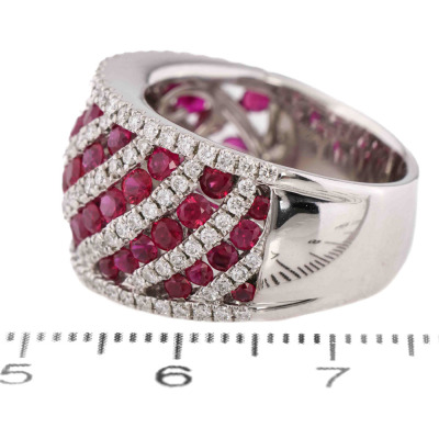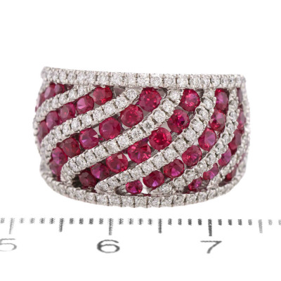 Ruby and Diamond ring with oval shape Natural Rubies totalling 2.42ct and round Natural Diamonds totalling 0.98ct (Estimated grading: G-H SI). 18ct white gold. Ring size N 1/2. Band width: 7.1mm- 9.7mm. Weight: 14.5g. With Certificate #421587. (Pre-owned)