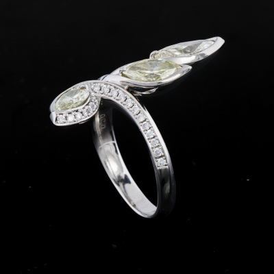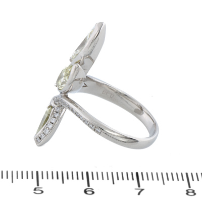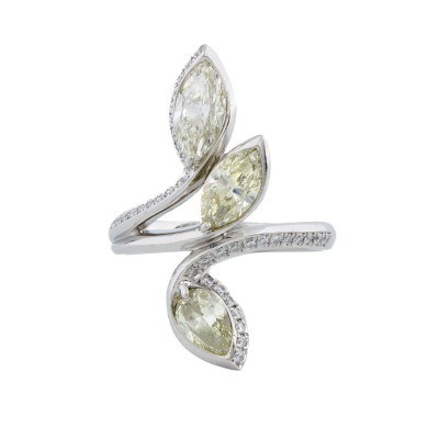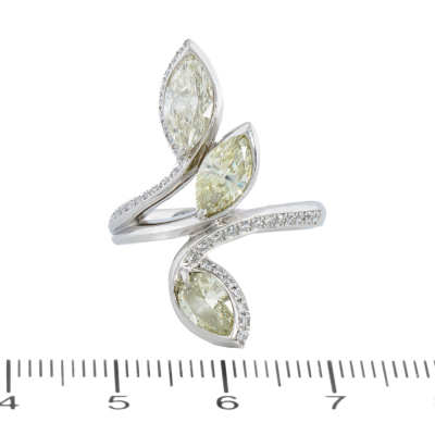 Diamond ring with 3 marquise cut Natural Diamonds totalling 2.13ct (Estimated grading: Light Yellow - Yellow SI) and surrounding round Natural Diamonds totalling 0.30ct (Estimated grading: G-H SI). Platinum - 950. Ring size O1/2. Band width: 2.9mm - 3.5mm. Weight: 11.4g. (Pre-owned)