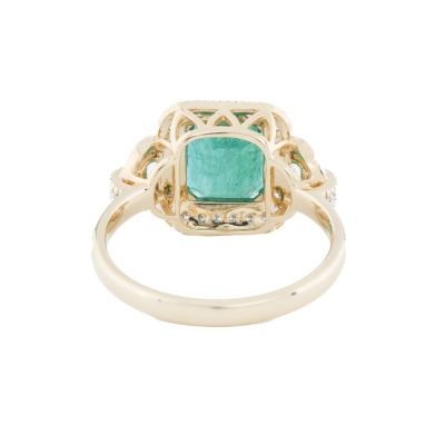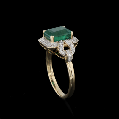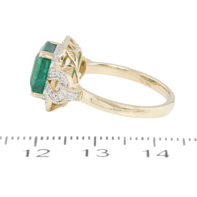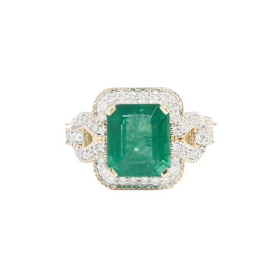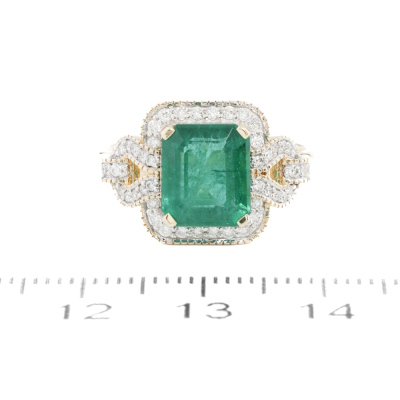 Emerald and Diamond ring with centre emerald cut Natural Emerald of approximately 2.45ct and round Natural Diamonds totalling 0.26ct. 14ct yellow gold. Ring size N. Band width: 2.2mm. Weight: 4.0g. (Pre-owned)