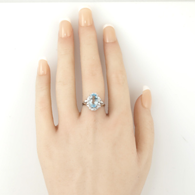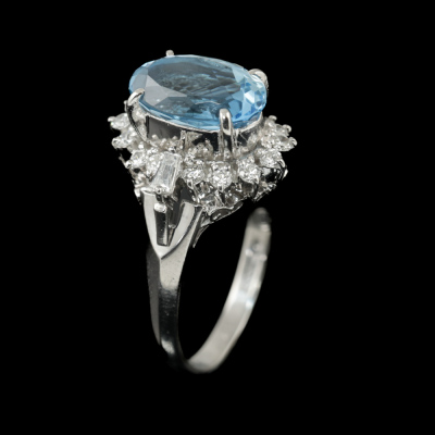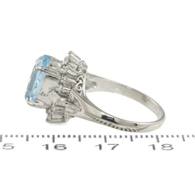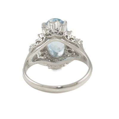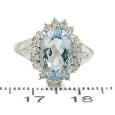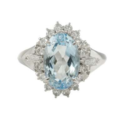 Aquamarine and Diamond ring with oval shape Natural Aquamarine of 2.48ct and round & baguette cut Natural Diamonds totalling 0.41ct (Estimated grading: F-G SI). Platinum - 900. Ring size L. Band width: 2.1mm - 3.4mm. Weight: 7.3g. With engraving: '83 S to M'. (Pre-owned)