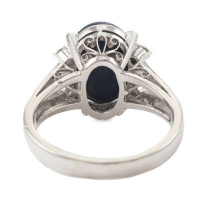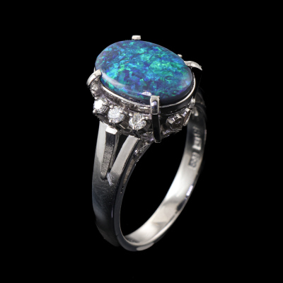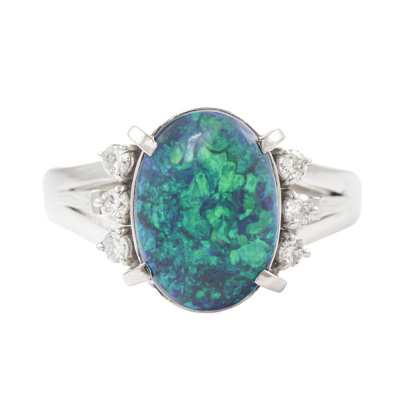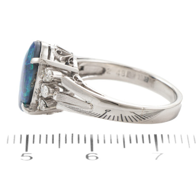 Opal and Diamond ring with oval cabochon cut solid Black Opal of 2.48ct and round Natural Diamonds totalling 0.16ct. Platinum - 900. Ring size M. Band width: 2.7mm - 3.3mm. Weight: 6.9g. (Pre-owned)
