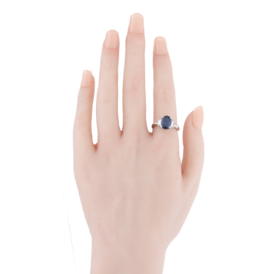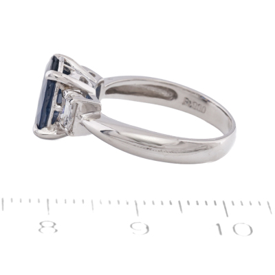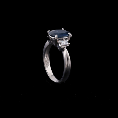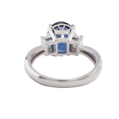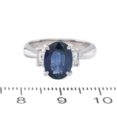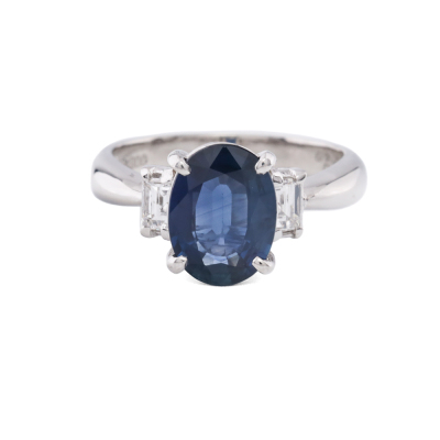 Sapphire and Diamond ring with oval shape Natural Blue Sapphire of 2.49ct and 2 baguette cut Natural Diamonds totalling 0.40ct (Estimated grading: G VS-SI). Platinum - 900. Ring size M. Band width: 2.5mm-3.3mm. Weight: 6.0g.