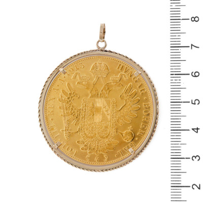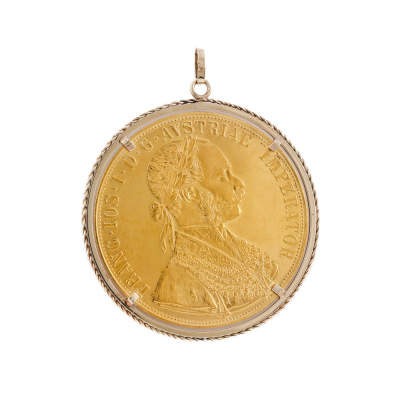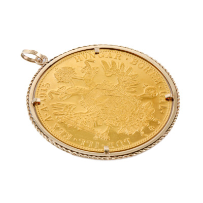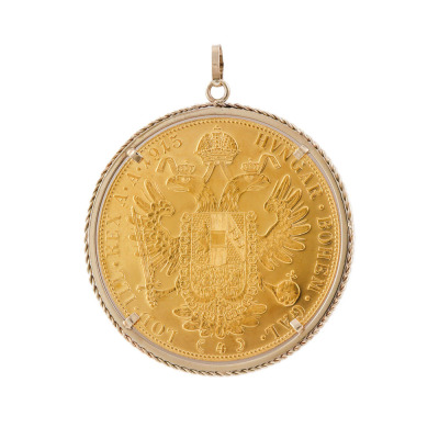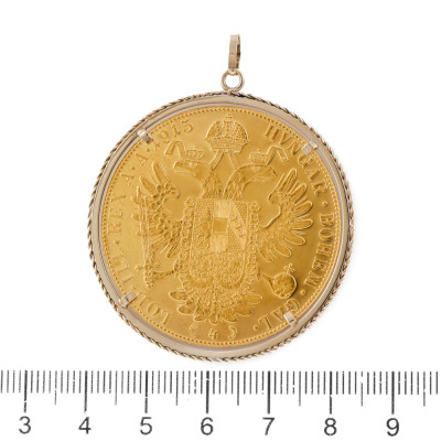 24ct 1915 Austrian Ducat gold coin pendant. 24ct yellow gold coin and 9ct yellow gold frame (XRF tested, no stamp). Diameter: 4.5cm. No chain provided. Weight: 16.6g. (Pre-owned)