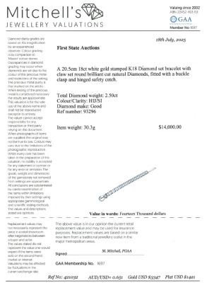Diamond bracelet with round Natural Diamonds totalling 2.50ct (Estimated grading: HIJ SI). 18ct white gold. Length: 20.5cm. Wrist size: 18.5cm. Weight: 30.3g. With Valuation Certificate #421032. (Pre-owned)