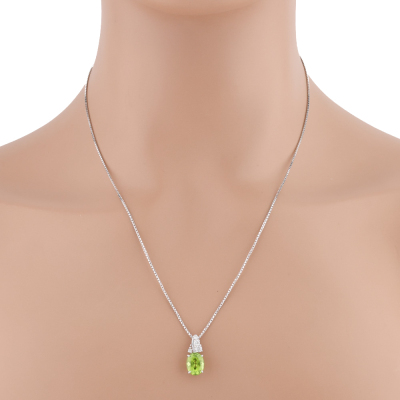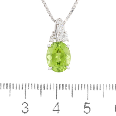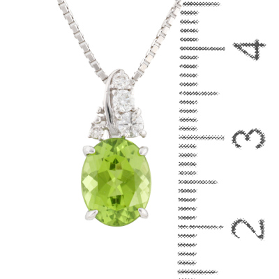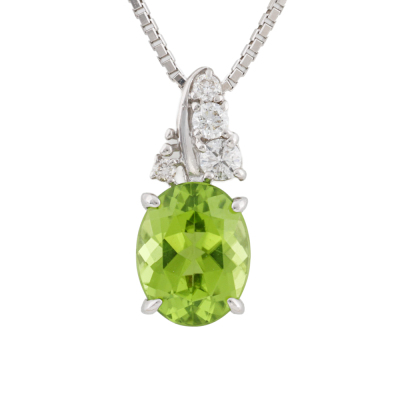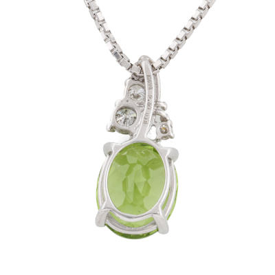 Peridot & Diamond pendant with an oval shape Natural Peridot of 2.50ct and 4 round Natural Diamonds totalling 0.19ct. 18ct white gold with 50cm adjustable 18ct white gold chain. Weight: 5.3g.