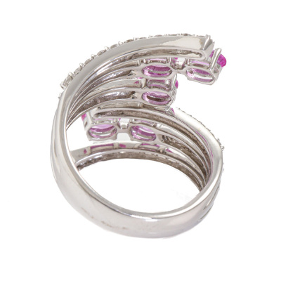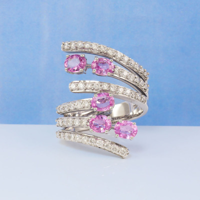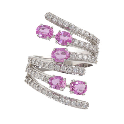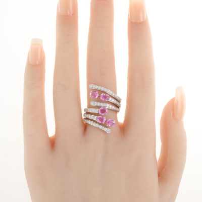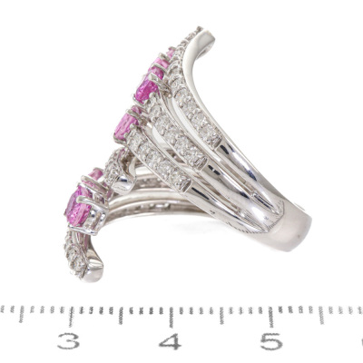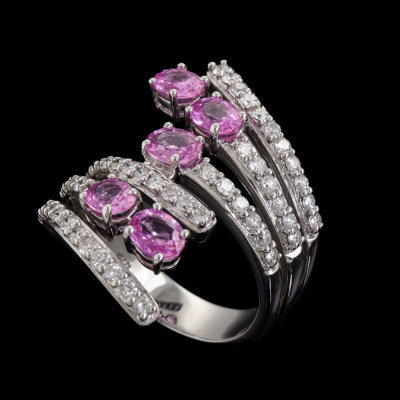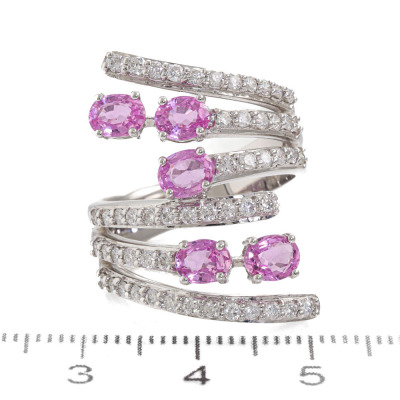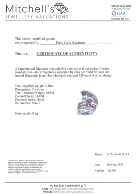 Sapphire and Diamond ring with 5 oval shape Natural purplish Pink Sapphires totalling 2.50ct and round Natural Diamonds totalling 0.88ct (Estimated grading: H-I SI). 18ct white gold. Ring size N. Band width: 4.7mm-5.7mm. Weight: 9.6g. With Certificate #420529. (Pre-owned)