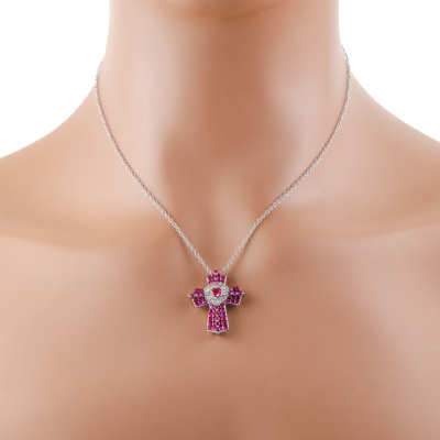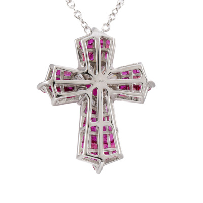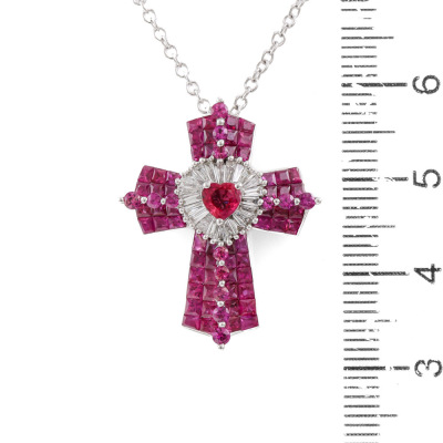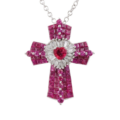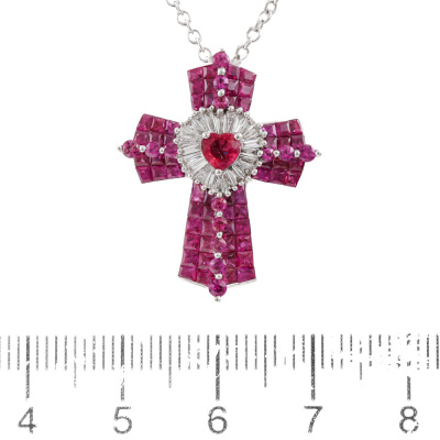 Cross design pendant with heart, round & carre cut Natural Rubies totalling approximately 2.50ct and baguette cut Natural Diamonds totalling approximately 0.30ct (Estimated grading: G VS). 18ct white gold with 40.5cm 18ct white gold chain. Weight: 6.4g.