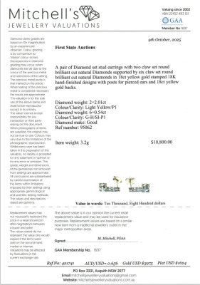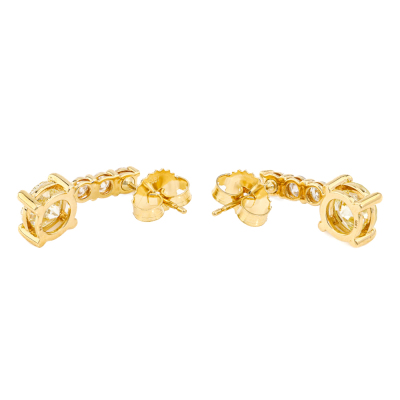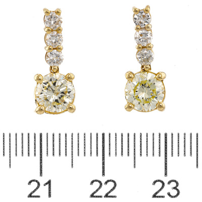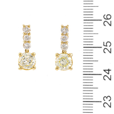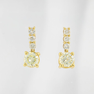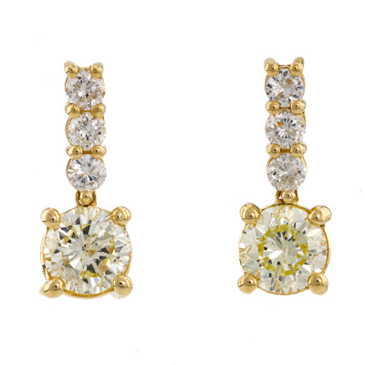 Diamond earrings with 2 round Natural Diamonds totalling 2.01ct (Estimated grading: Natural Light Yellow P1) and 6 remaining round Natural Diamonds totalling 0.54ct (Estimated grading: G-H SI-P1). 18ct yellow gold. Drop length: 1.6cm. Weight: 3.2g. With Valuation Certificate #421741. (Pre-owned)
