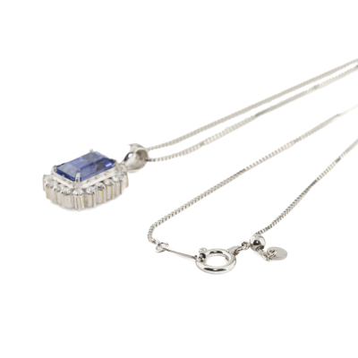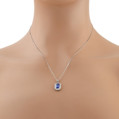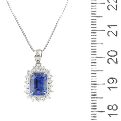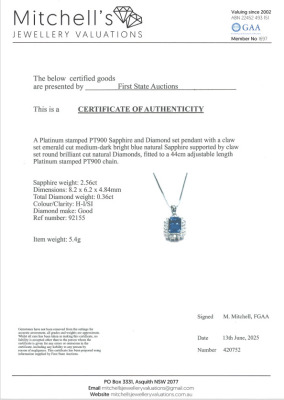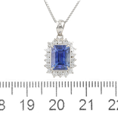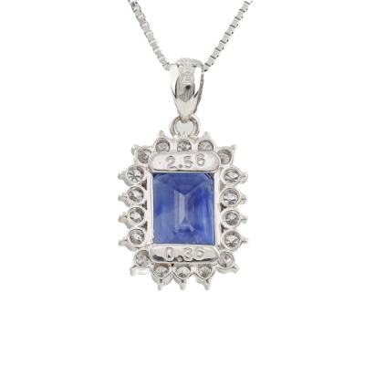 Sapphire and Diamond pendant with emerald cut Natural Blue Sapphire of 2.56ct and round Natural Diamonds totalling 0.36ct (Estimated grading: H-I SI). Platinum - 900 with 44cm Platinum - 850 adjustable chain. Weight: 5.4g. With Certificate #420752. (pre-owned)
