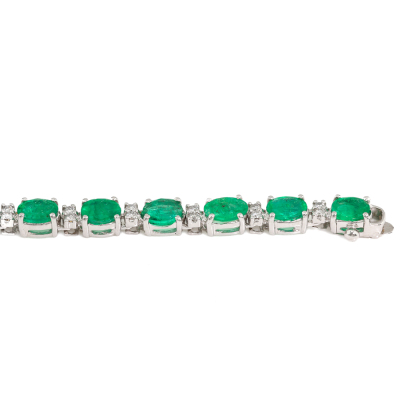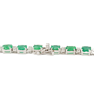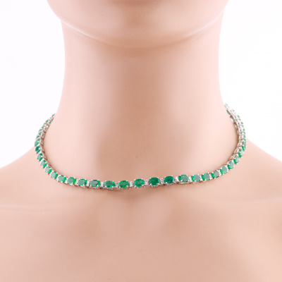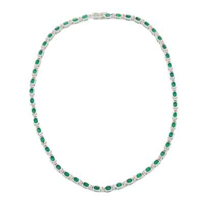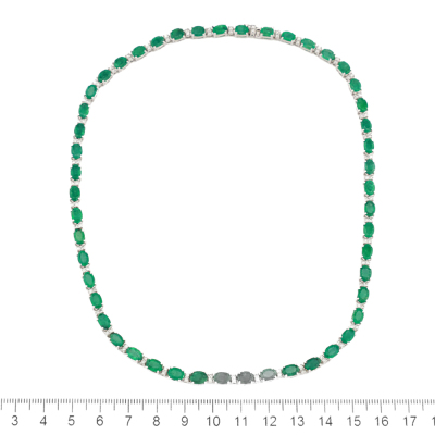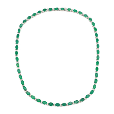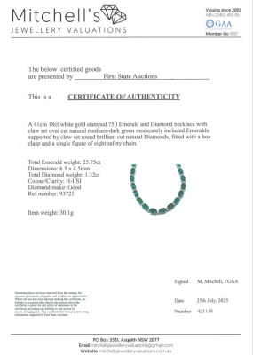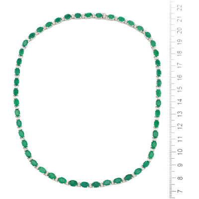 Emerald and Diamond necklace with oval shape Natural Emeralds totalling 25.75ct and round Natural Diamonds totalling 1.32ct (Estimated grading: H-I SI). 18ct white gold. Length: 41cm. Weight: 30.0g. With Certificate #421118. (Pre-owned)