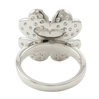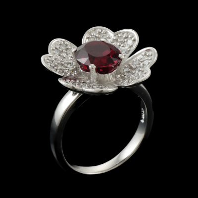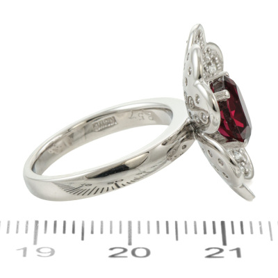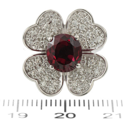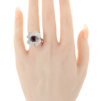 Floral design ring with oval shape Natural red Garnet of 2.57ct and round Natural Diamonds totalling 0.47ct (Estimated grading: G VS). 18ct white gold. Band width: 2.4mm - 2.9mm