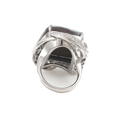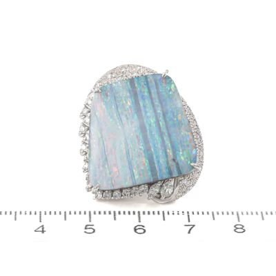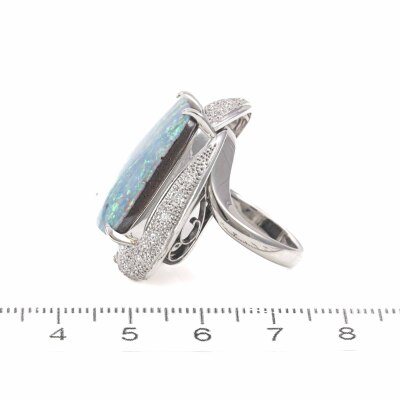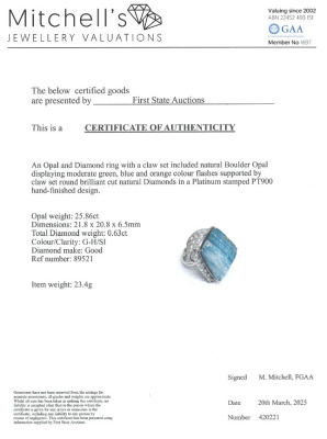 Opal and Diamond ring with solid Natural Boulder Opal of 25.86ct and round Natural Diamonds totalling 0.63ct (Estimated grading: G-H SI). Platinum - 900. Ring size L1/2. Band width: 3mm - 2.8mm. Weight: 23.4g. With Certificate #420221.