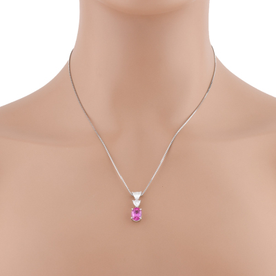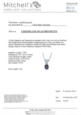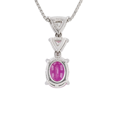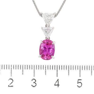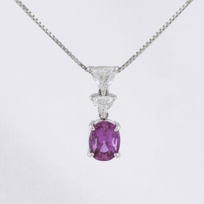 Sapphire and Diamond pendant with oval shape Natural Pink Sapphire of 2.58ct and 2 trilliant cut Natural Diamonds totalling 0.80ct (Estimated grading: G-H VS-SI). Platinum-900 with 45cm Platinum-850 adjustable chain. Weight: 6.5g. With Certificate #421606. (Pre-owned)