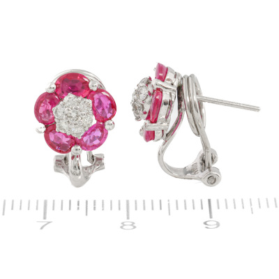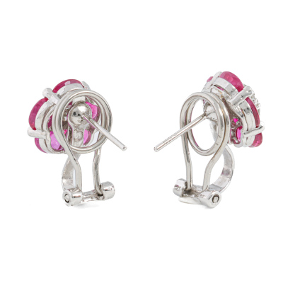 Flora design clip-on earrings (for pierced ears) with 10 oval cabochon cut Natural Rubies totalling 2.58ct and 14 round Natural Diamonds totalling 0.36ct (Estimated grading: H-I SI). Platinum - 900. Weight: 5.6g. (Pre-owned)