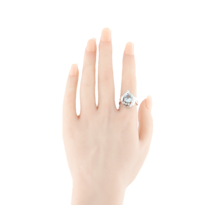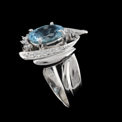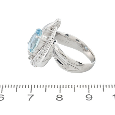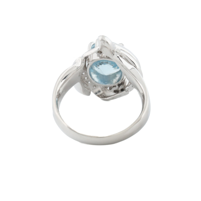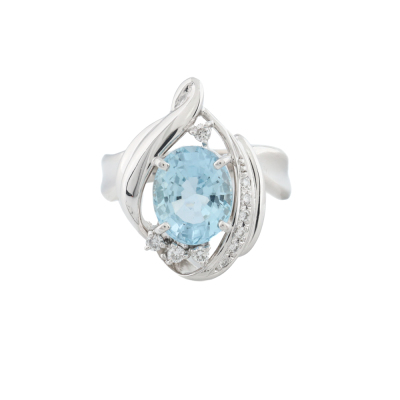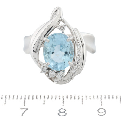 Aquamarine and Diamond ring with oval shape Natural Aquamarine of 2.59ct and round Natural Diamonds totalling 0.13ct. Platinum - 900. Ring size M. Band width: 2.6mm - 5.0mm. Weight: 11.2g. (Pre-owned)