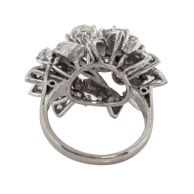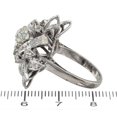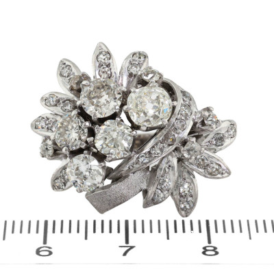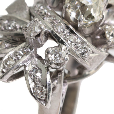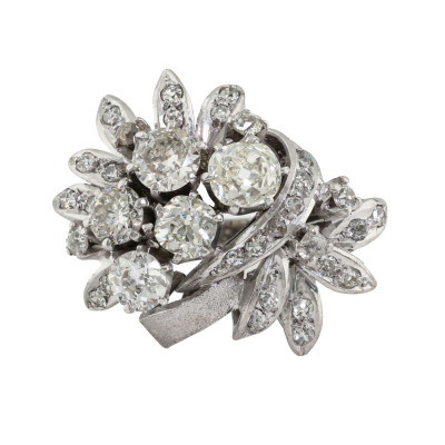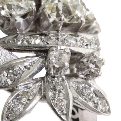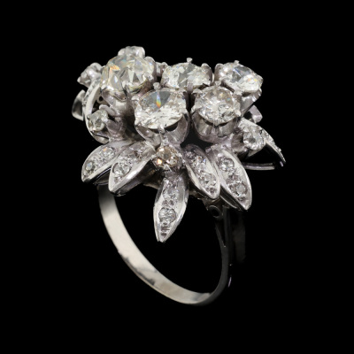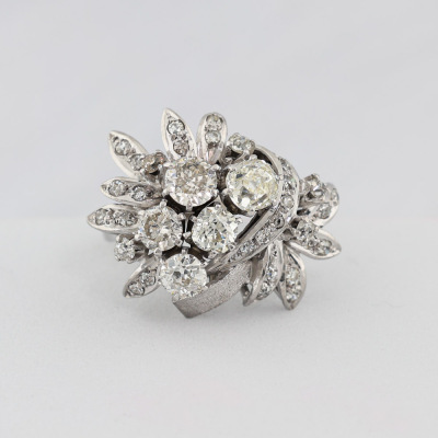 Botanical design Diamond ring with old cut Natural Diamonds totalling approximately 2.60ct (Estimated grading: G - K SI-P1). 14ct white gold (XRF tested, no stamp). Ring size M1/2. Band width: 2.3mm - 3.2mm. Weight: 10.4g.