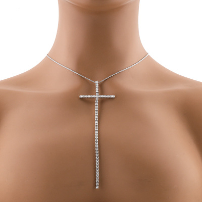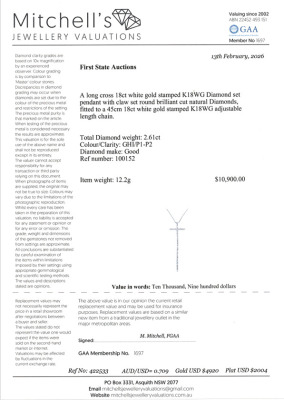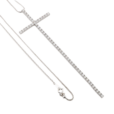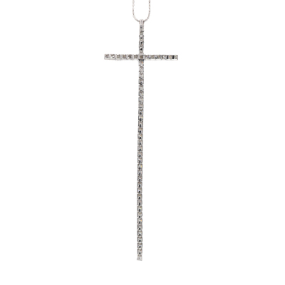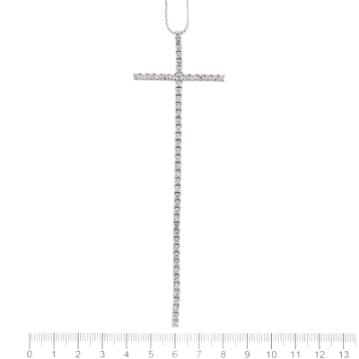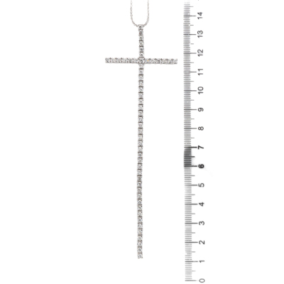 Long cross pendant with round Natural Diamonds totalling 2.61ct (Estimated grading: GHI P1-P2). Pendant length: 12cm. 18ct white gold with 45cm 18ct white gold adjustable chain With Valuation Certificate #422533.