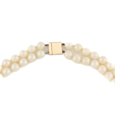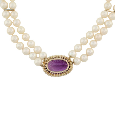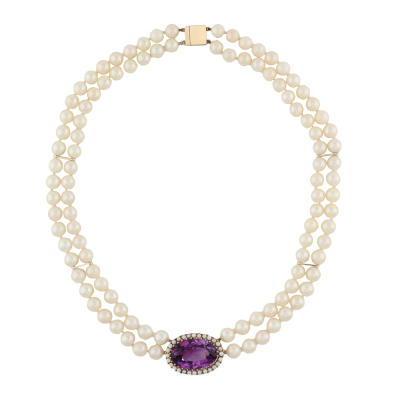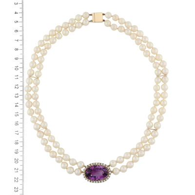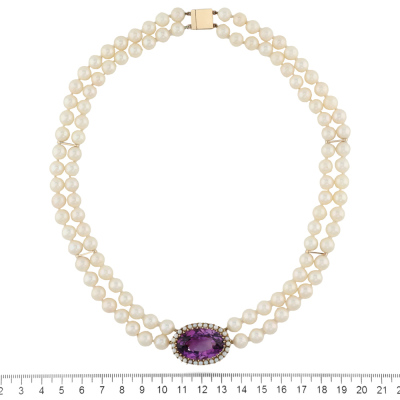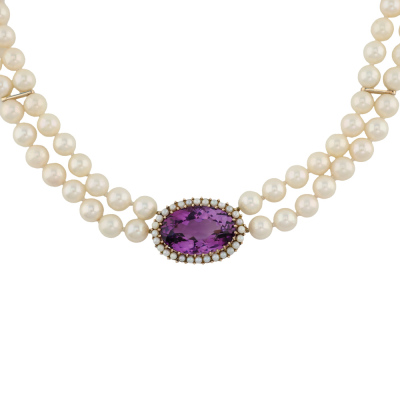 Amethyst and two-row Pearl necklace with a centre oval shape Natural Amethyst of approximately 26.53ct and surrounding Akoya seed Pearls of 2.2mm attached with 104 Akoya Pearls of 7.5mm - 8.0mm. 10ct yellow gold as XFR tested, no stamp, with 9ct yellow gold clasp. Length: 47cm. Weight: 85.9g. (Pre-owned)