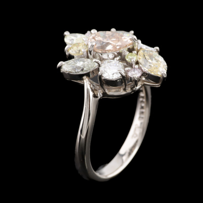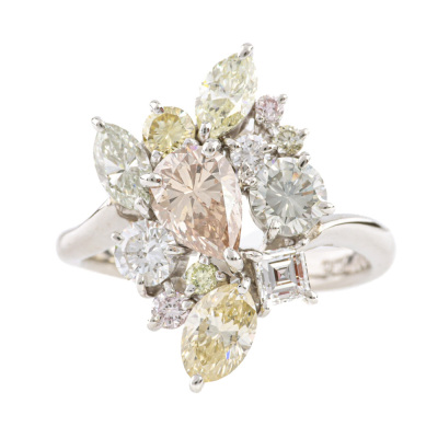 Diamond ring with mixed cut multi colour Natural Diamonds totalling 2.65ct (Estimated grading: Pink Champagne , Faint Pink - Light Light Pink, Light Yellow - Fancy Yellow, Light Greenish Yellow & G-H SI). Platinum - 900. Rings size L. Band width: 2.6mm - 2mm. Weight: 7.8g. With Certificate #421089. (Pre-owned)