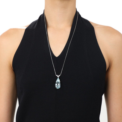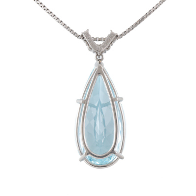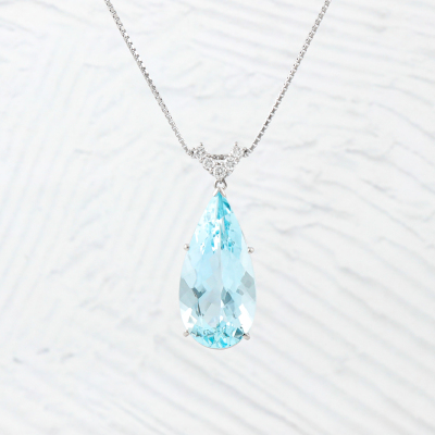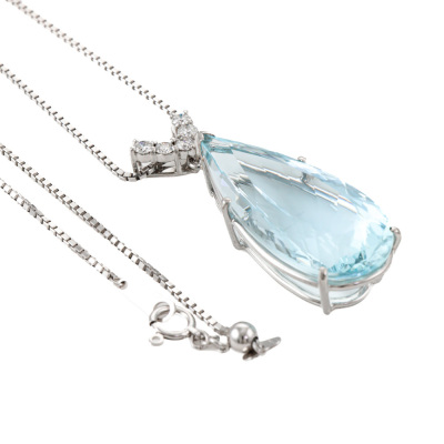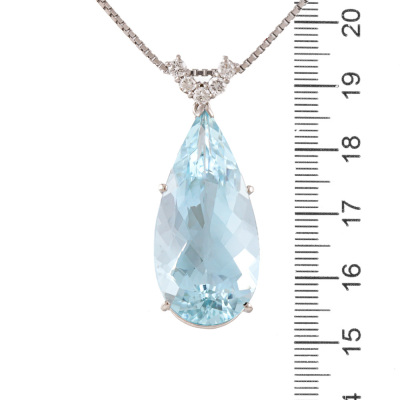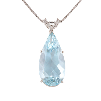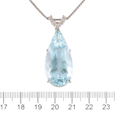 Aquamarine and Diamond pendant with pear shape Natural Aquamarine of 26.85ct and round Natural Diamonds totalling 0.37ct (Estimated grading: G-H SI). Platinum-900 with 65.5cm Platinum-850 adjustable chain. Weight: 19.7g.