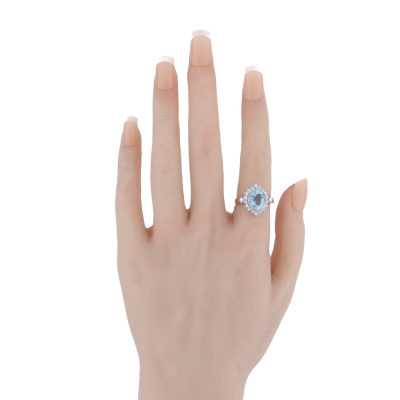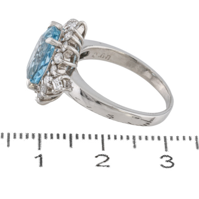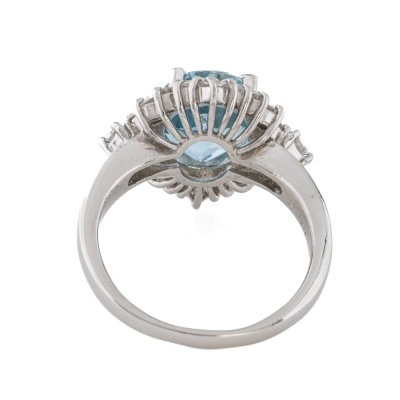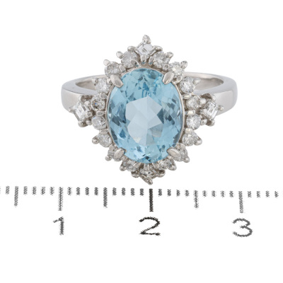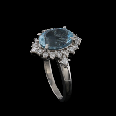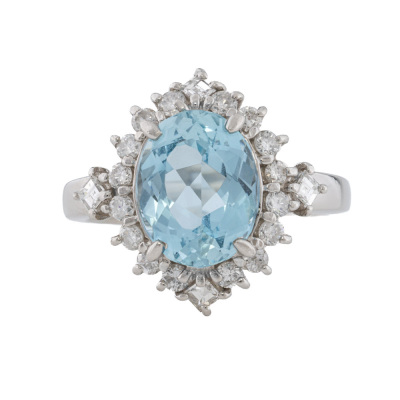Aquamarine and Diamond ring with centre oval shape Natural Aquamarine of 2.68ct and round & carre cut Natural Diamonds totalling 0.58ct (Estimated grading: G-H VS-SI). Platinum - 900. Ring size L 3/4. Band width: 1.9mm - 2.7mm. Weight: 7.7g.