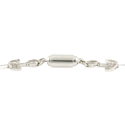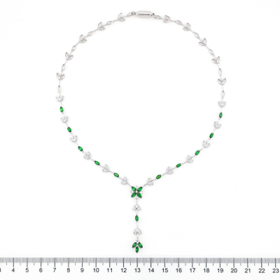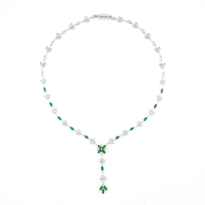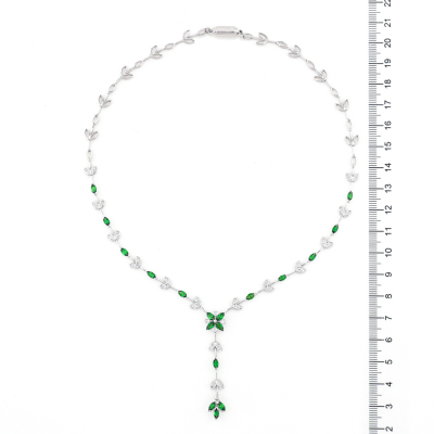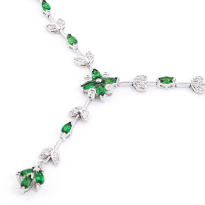 Garnet and Diamond necklace with marquise cut Natural Tsavorite Garnet totalling 2.71ct and round Natural Diamonds totalling 0.55ct (Estimated grading: HIJ SI-P1). 18ct white gold with magnetic base metal clasp (XRF tested). Length: 40cm. Weight: 18.5g. With Certificate #421468. (Pre-owned)