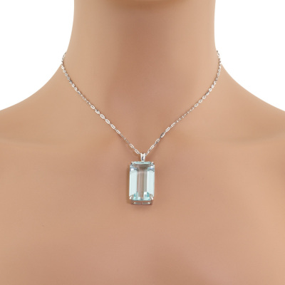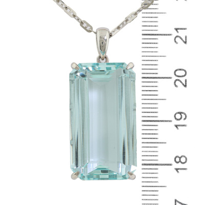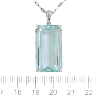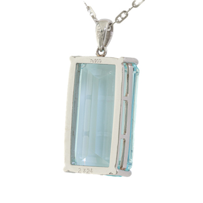 Aquamarine and Diamond pendant with a emerald cut Natural Aquamarine of 27.24ct. Platinum - 900 with 40.0cm 18ct white gold chain. Weight: 14.4g. (Pre-owned)
