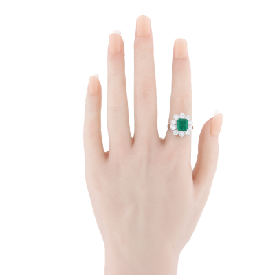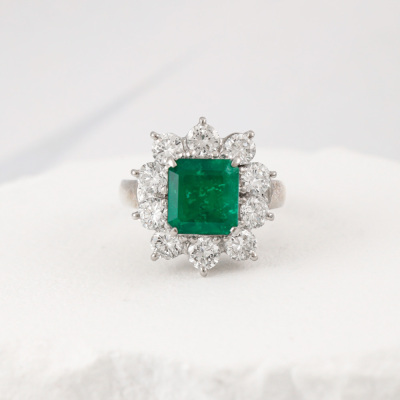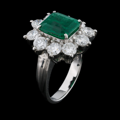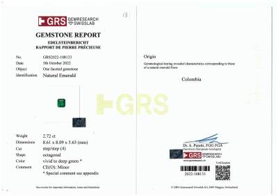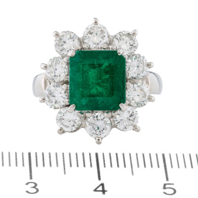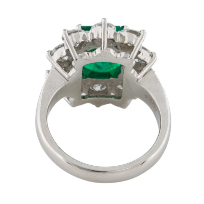 Emerald and Diamond ring with centre square emerald cut vivid green Natural Muzo Green Colombian Emerald of 2.72ct (with GRS Report #GRS2022-108133 & GRS Appendix to report stating: Muzo Green) and round Natural Diamonds totalling 1.97ct (Estimated grading: G VS). Platinum - 900. Band width: 3.0mm - 3.2mm.