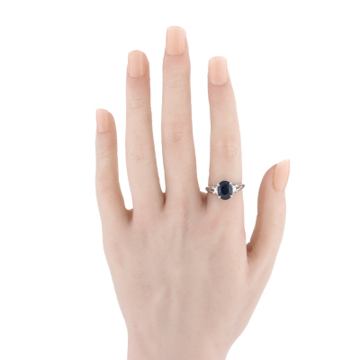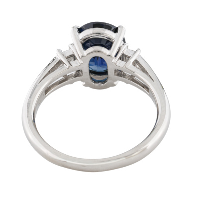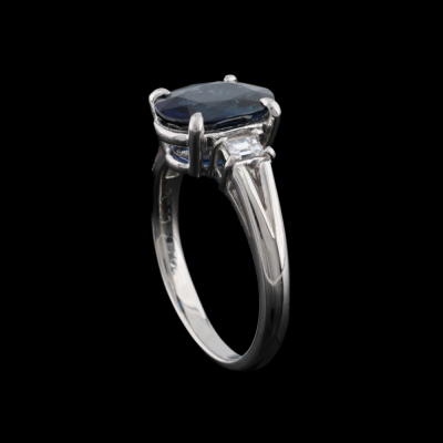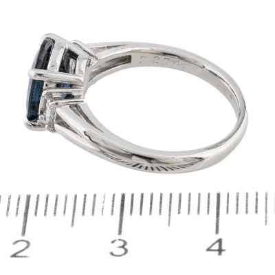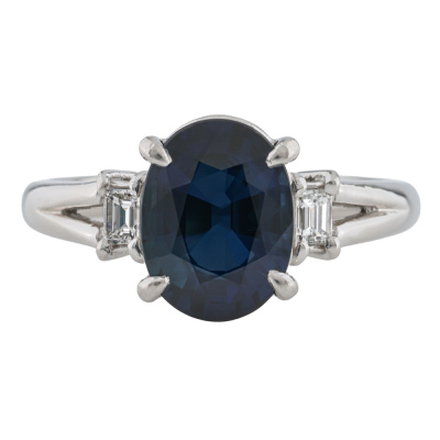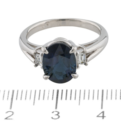 Sapphire and Diamond ring with an centre oval shape Natural Blue Sapphire of 2.74ct and 2 shoulder baguette cut Natural Diamonds totalling 0.10ct. Platinum - 900. Band width: 2.1mm - 2.7mm.