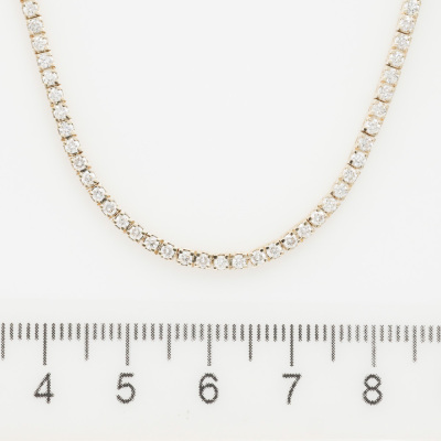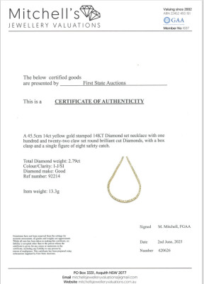 Diamond tennis necklace with 122 round Natural Diamonds totalling 2.79ct (Estimated grading: I-J SI). Length: 45.5cm. 14ct yellow gold. Weight: 13.3g. With Certificate #420626. (Pre-owned)