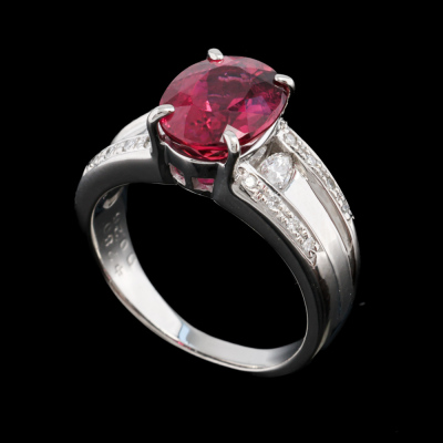 Rubellite and Diamond ring with oval shape Natural Rubellite of 2.80ct and round & marquise cut Natural Diamonds totalling 0.26ct. Platinum - 900. Ring size K 1/2. Band width: 2.2mm - 5.2mm. Weight: 9.5g.