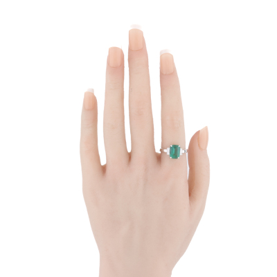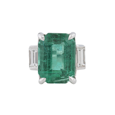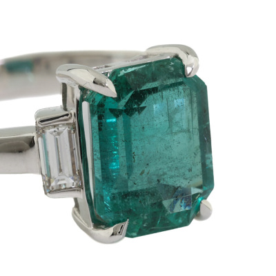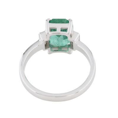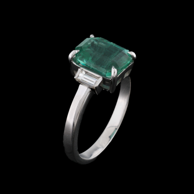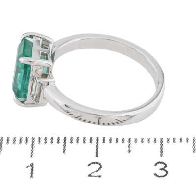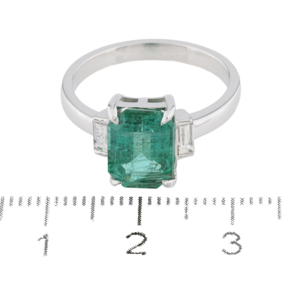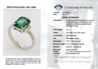 Emerald and Diamond ring with centre emerald cut Natural Emerald of approximately 2.83ct and baguette cut Diamonds totalling approximately 0.30cts (Estimated grading: G-H VS). 18ct white gold. Ring size N. Band width 2.5mm. Weight 4.1g. With GSL Summary Report #AA714179/1.