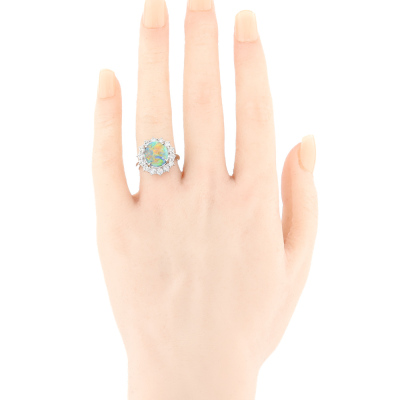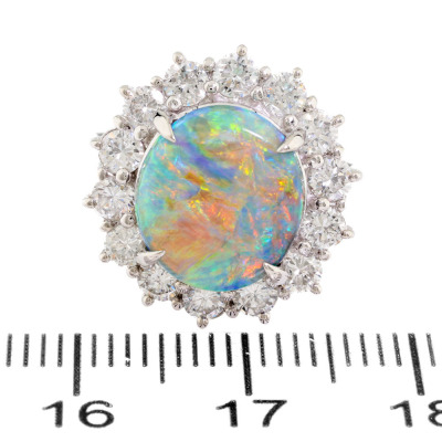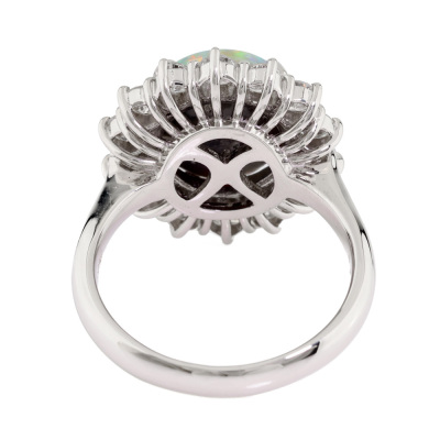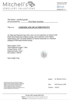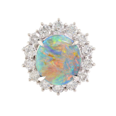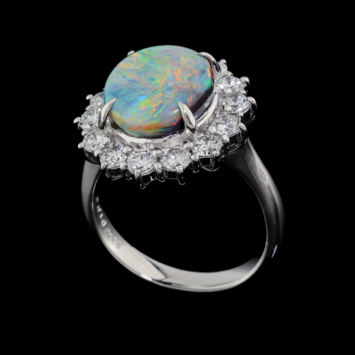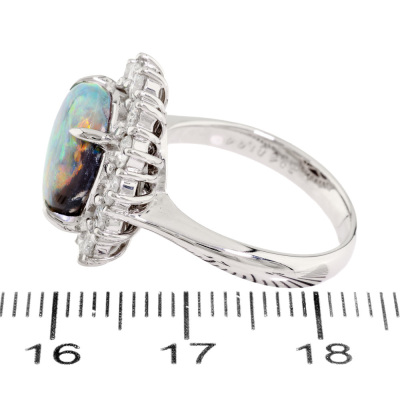 Opal and Diamond ring with centre oval cabochon cut solid Natural Black Opal of 2.84ct and round Natural Diamonds totalling 1.04ct (Estimated grading: G SI). Platinum - 900. Ring size: K1/4. Band width: 2.8mm - 2.6mm. Weight: 8.6g. With Certificate #422622.